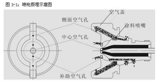 由空氣壓縮機(jī)產(chǎn)生的壓縮空氣,經(jīng)噴槍前部的空氣帽噴射出來時,就在與之相連的涂料噴嘴的前部產(chǎn)生了一個比大氣壓低的低壓區(qū)。在噴槍口產(chǎn)生的這個壓力差就把涂料從涂料貯罐中吸出來,并在壓縮空氣高速噴射力的作用下,霧化成微粒噴灑在被涂物表面。