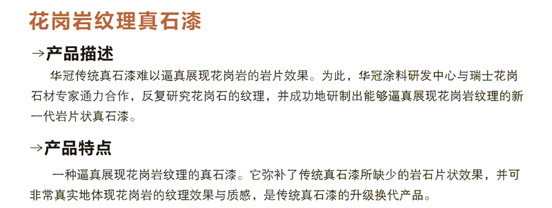 一種逼真展現(xiàn)花崗巖紋理的真石漆。它彌補了傳統(tǒng)真石漆所缺少的巖片狀況效果,并可非常真實地體現(xiàn)花崗巖的紋理效果與質(zhì)感,是傳統(tǒng)真石漆的升級換代產(chǎn)品。
