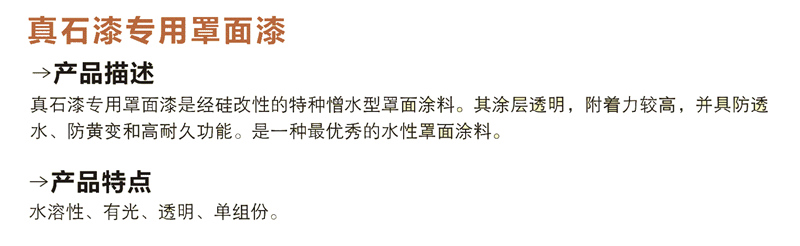 真石漆專用罩面漆是經(jīng)硅改性的特種憎水型罩面涂料。其涂層透明,附著力較高,并具有防透水,防變黃和高耐久功能。是一種最優(yōu)秀的水性罩面涂料。