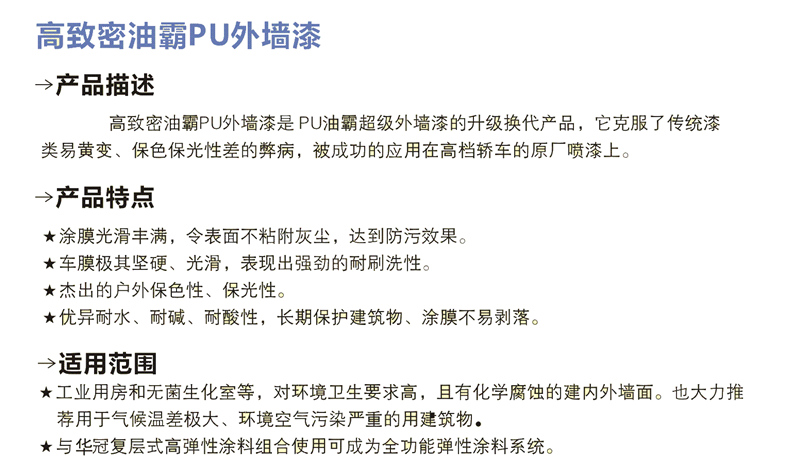 高致密油霸PU外墻漆是PU油霸超級外墻漆的升級換代產(chǎn)品,它克服了傳統(tǒng)漆類易變黃、保色保光性差的弊病,被成功的應用在高檔轎車的原廠噴漆上。