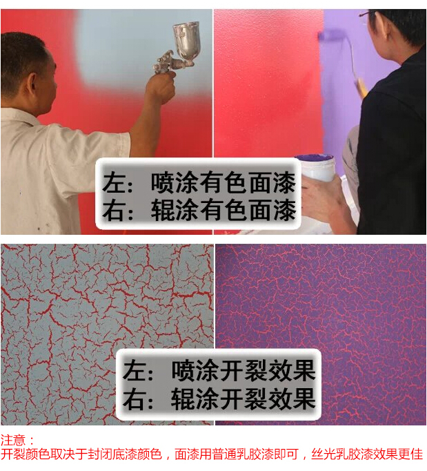 華冠水性裂紋劑顛覆傳統(tǒng)復雜的操作工藝,只需在墻面刷上封閉底漆后輥涂華冠裂紋劑,表干的情況下噴、涂(滾刷亦可)普通乳膠漆即可。絲光乳膠漆效果更佳。