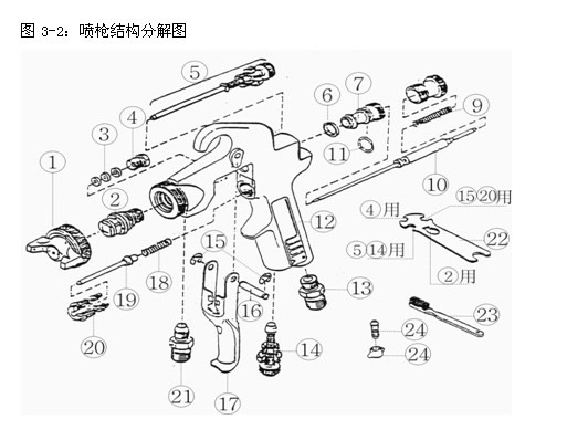 5、噴幅調(diào)整裝置12槍柄 18、空氣閥彈簧 24、進(jìn)氣管接頭