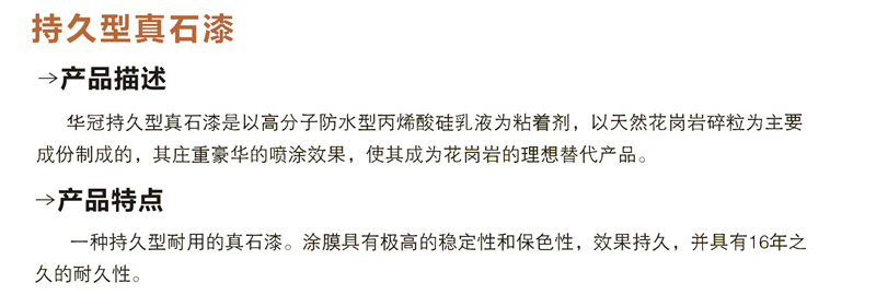 一種持久型耐用的真石漆。涂膜具有極高的穩(wěn)定性和保色性,效果持久,并具有16年之久的耐久性。